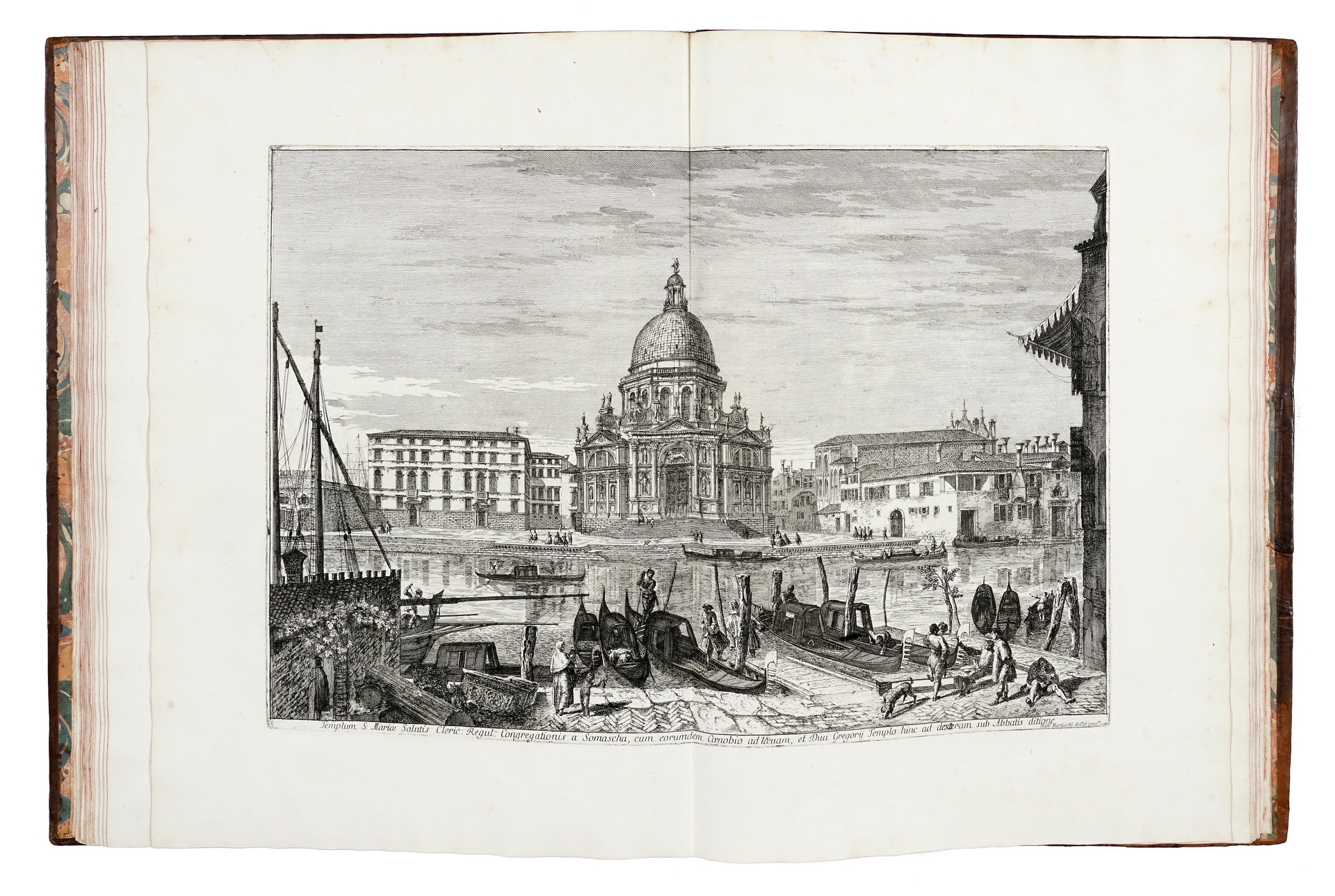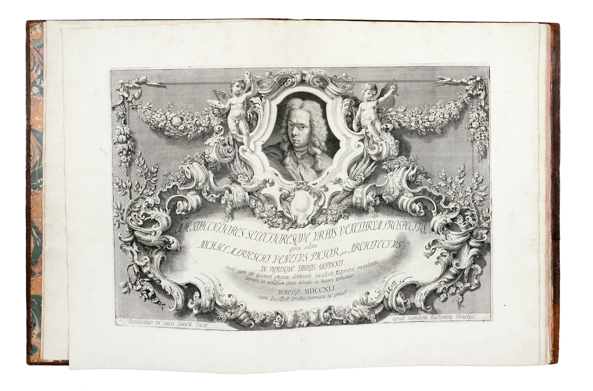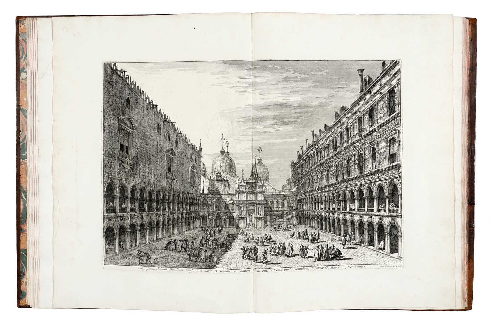 Folio (437 x 325 mm.), contemporary speckled calf, gilt spine with raised bands, nicely tooled in gold in compartments, title on red morocco label, end-leaves in contemporary marbled paper, an excellent, genuine fresh copy (careful repairs to the corners, and to spine). Title-page with the portrait of the artist by Carlo Orsolini after Angelo Trevisani, dated 1741, and the complete set of 21 etchings on laid paper, watermarks Crossbow, all early, fine and luminous impressions of the first state (of four), before the plate numbers and before the baroque church facade on Campo S. Rocco was altered, with very wide margins, in very fresh condition.
