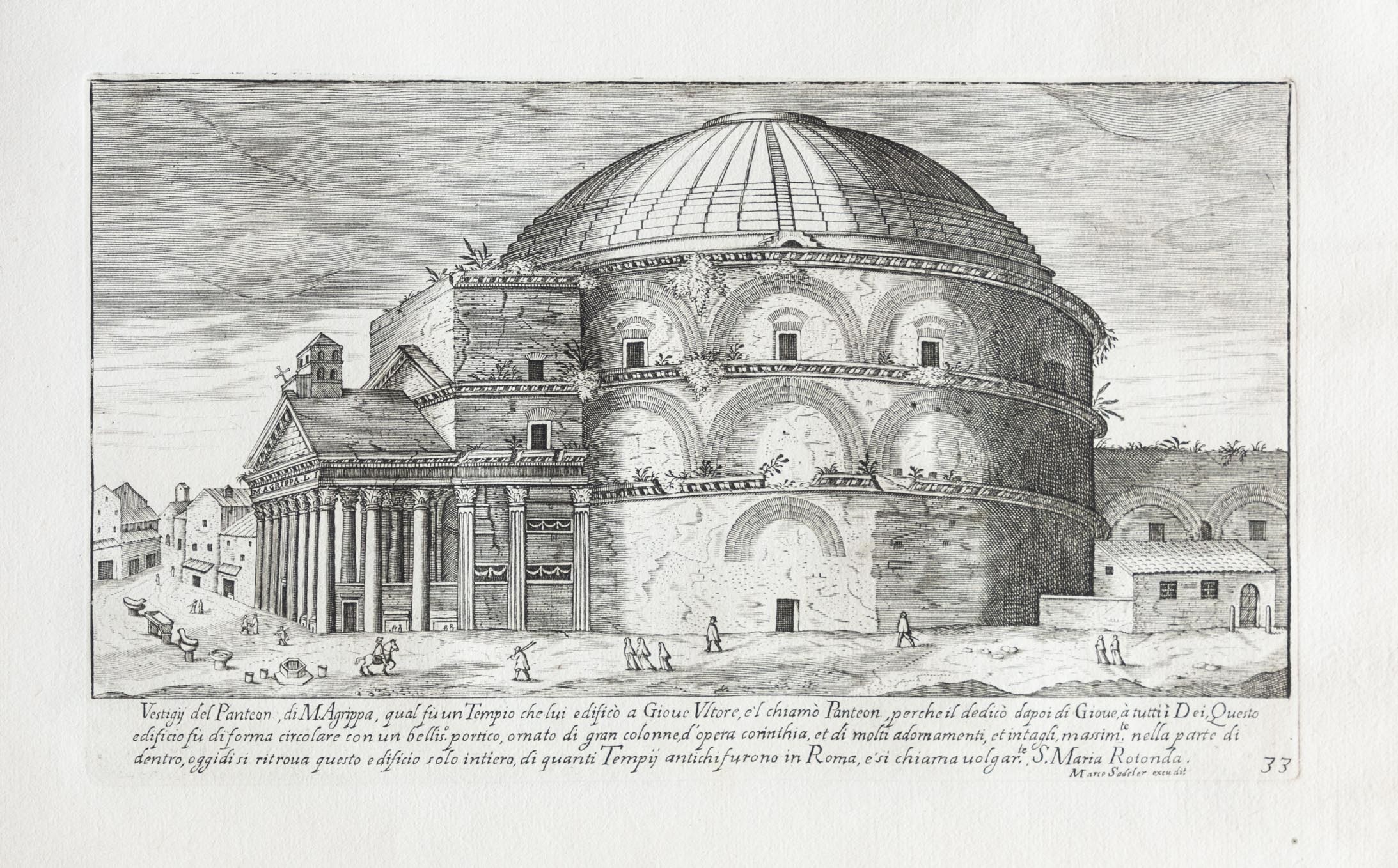 Re-engraving of the views of Rome by the Flemish painter and engraver Aegidius Sadeler (1570-1629) first published in Prague in 1606, which in turn was a reproduction of Du Perac’s “I Vestigi dell’antichità di Roma”. The copperplate engravings show views of Roman ruins, temples, triumphal arches, the Palatine Hill, thermal baths and other buildings in Rome and the surrounding area. The first plate bears an engraved dedication to Johann Matthäus Wacker von Wackerfels. Thieme-B. XXIX, 301.