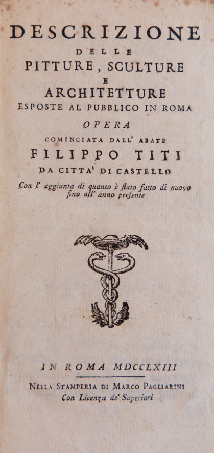 TITI, FILIPPO – Descrizione delle pitture, sculture e architetture esposte al pubblico in Roma … Con l’ aggiunta di quanto è stato fatto di nuovo fino all’ anno presente. Rome, Pagliarini, 1763.