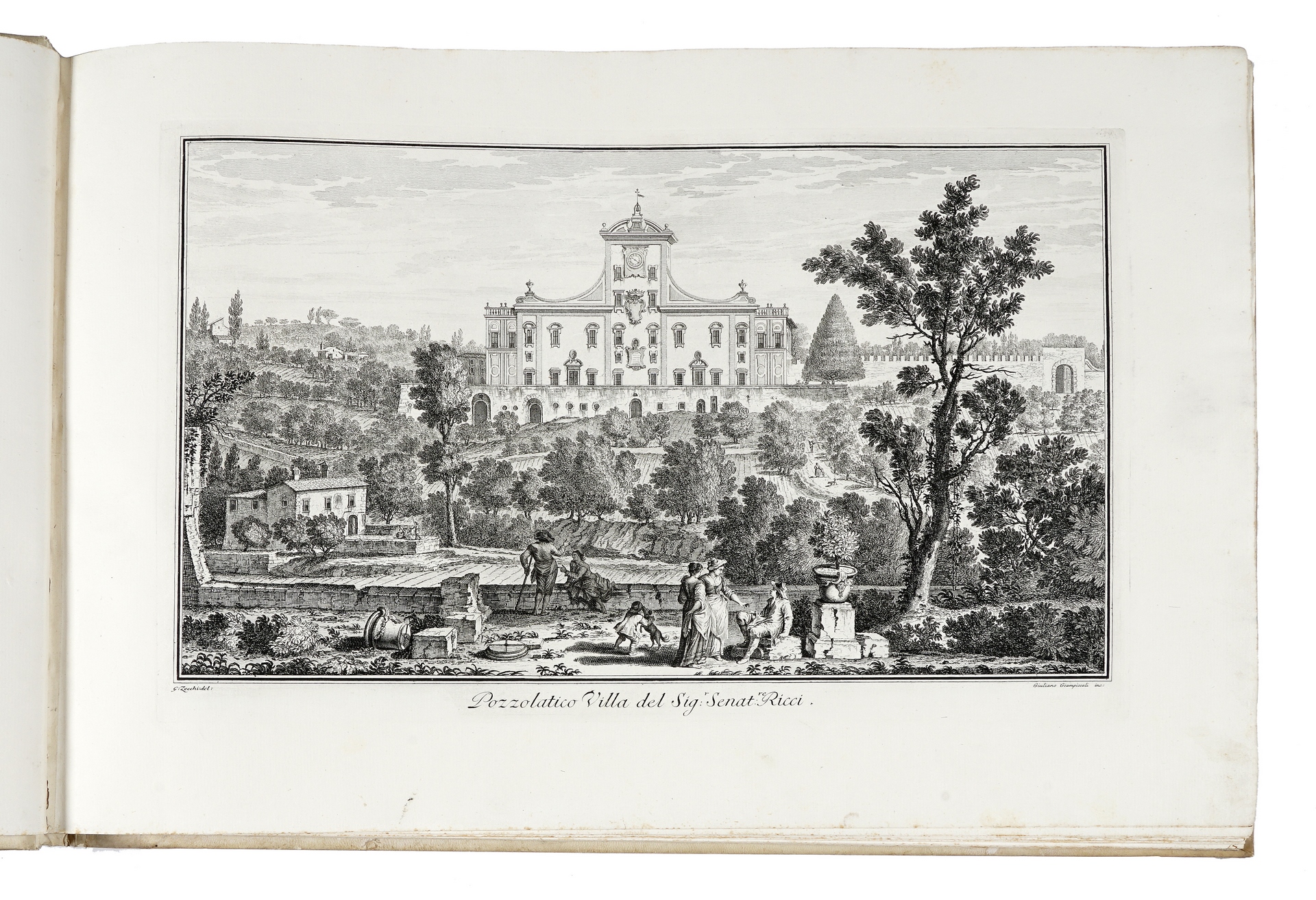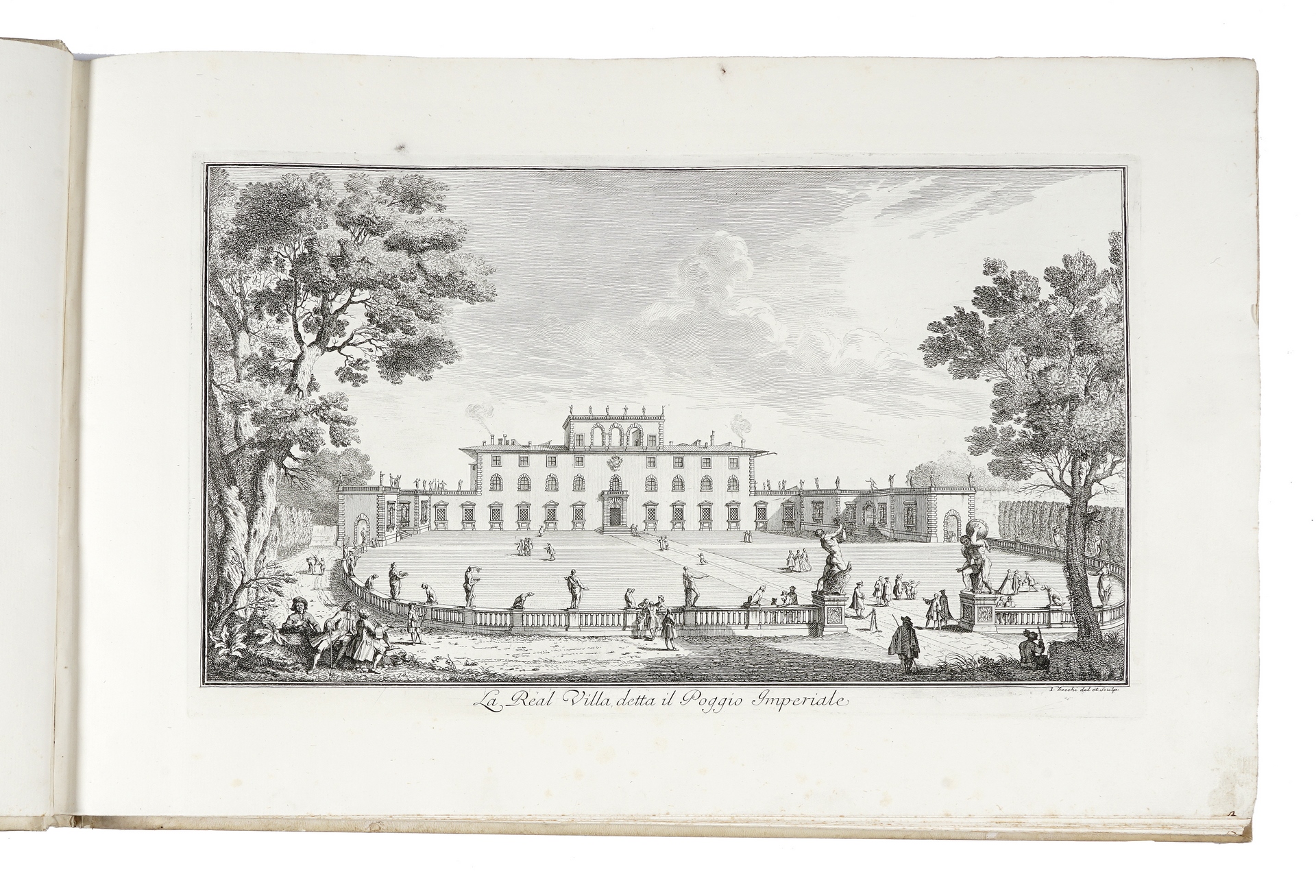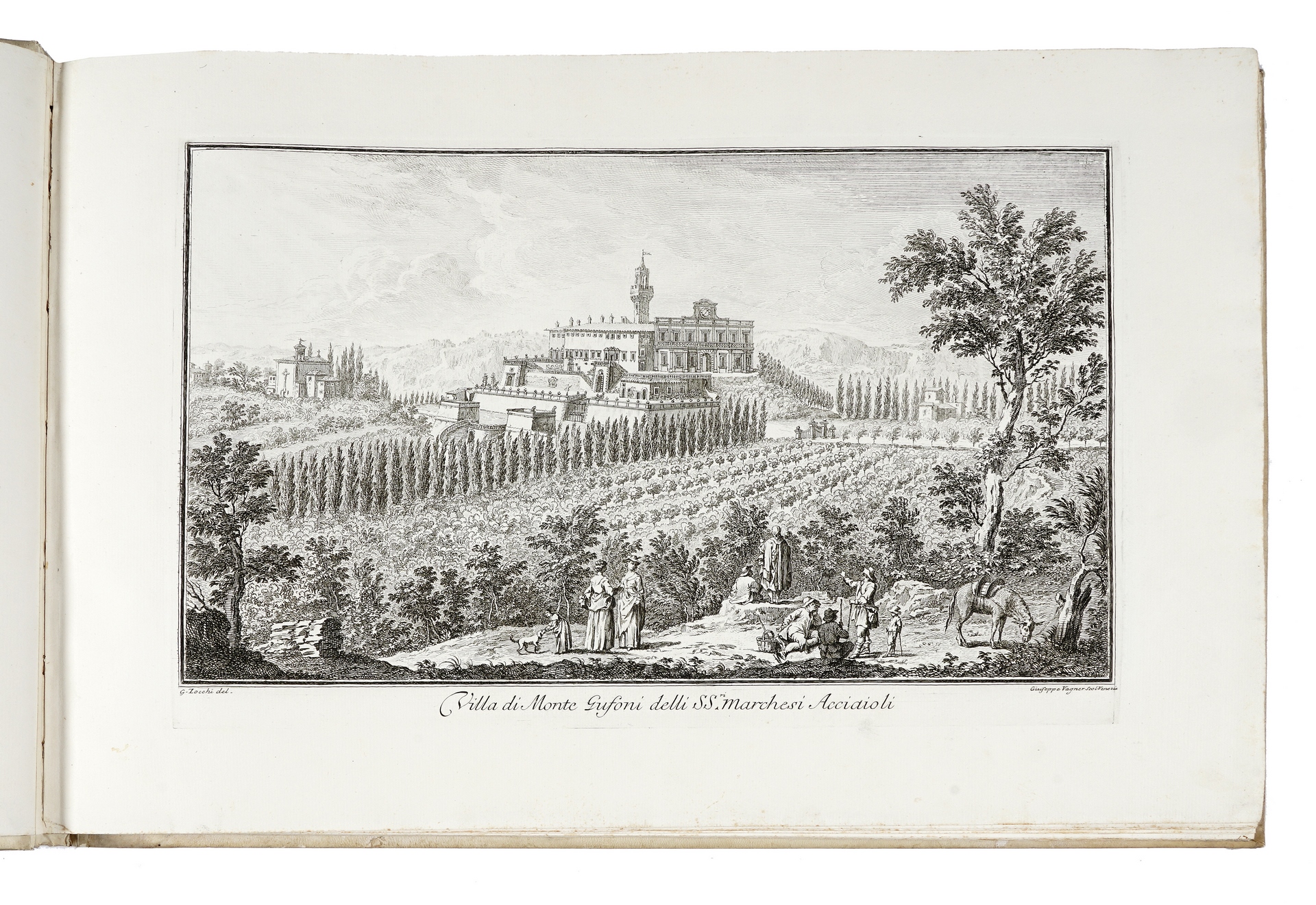 First edition of this magnificent collection of views of Tuscan villas and the related gardens, very important for the history of Italian architecture, and indeed one of the most significant Tuscan books of the 18th century. The work was commissioned by the Marquis Andrea Gerini (1691-1766) to celebrate the beauties of Tuscany following the example of Venetian works by Canaletto, Visentini and Marieschi, who had reached a great popularity in those years. Giuseppe Zocchi (Florence 1711-1767) made the drawings for the plates, then engraved by several famous artists, such as GB Piranesi, M. Marieschi, G. Giampiccoli, G. Wagner, P. Monaco, F. Morghen, G. Filosi and others. “The principal etchers of the Vedute delle ville were Giuseppe Benedetti, Pietro Monaco, Filippo Morghen and Joseph Wagner. Among the better-known contributors to the series were the Venetians Michele Marieschi (1696-1743), who in 1741 published his own series of views of Venice, and Giovanni Battista Piranesi (1720-1778). “The ‘Ville’ print series is an architectural history of these buildings, defining the representation and self-fashioning of a building type. In contrast with the villas of the Veneto, it is astonishing how few of the elements of classical architecture, such as porticoes, columns, pediments, or parapets with statues, are in use” (Millard). Berlin Katalog 2701; Millard, italian books 169. R.M. Mason, Giuseppe Zocchi, Firenze 1981. Hind, Piranesi 75.